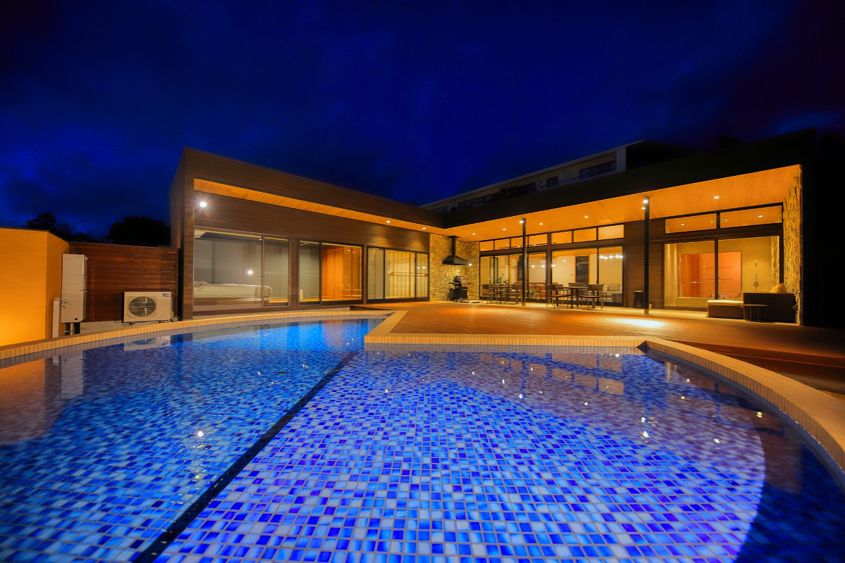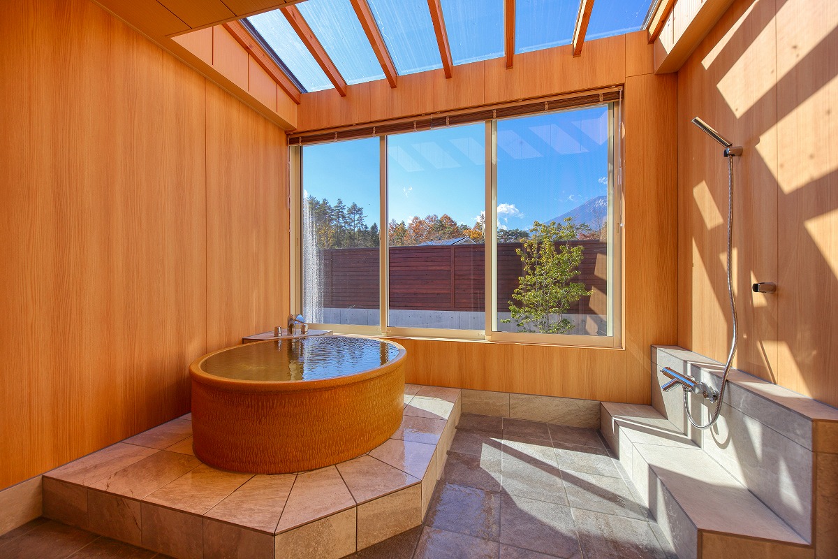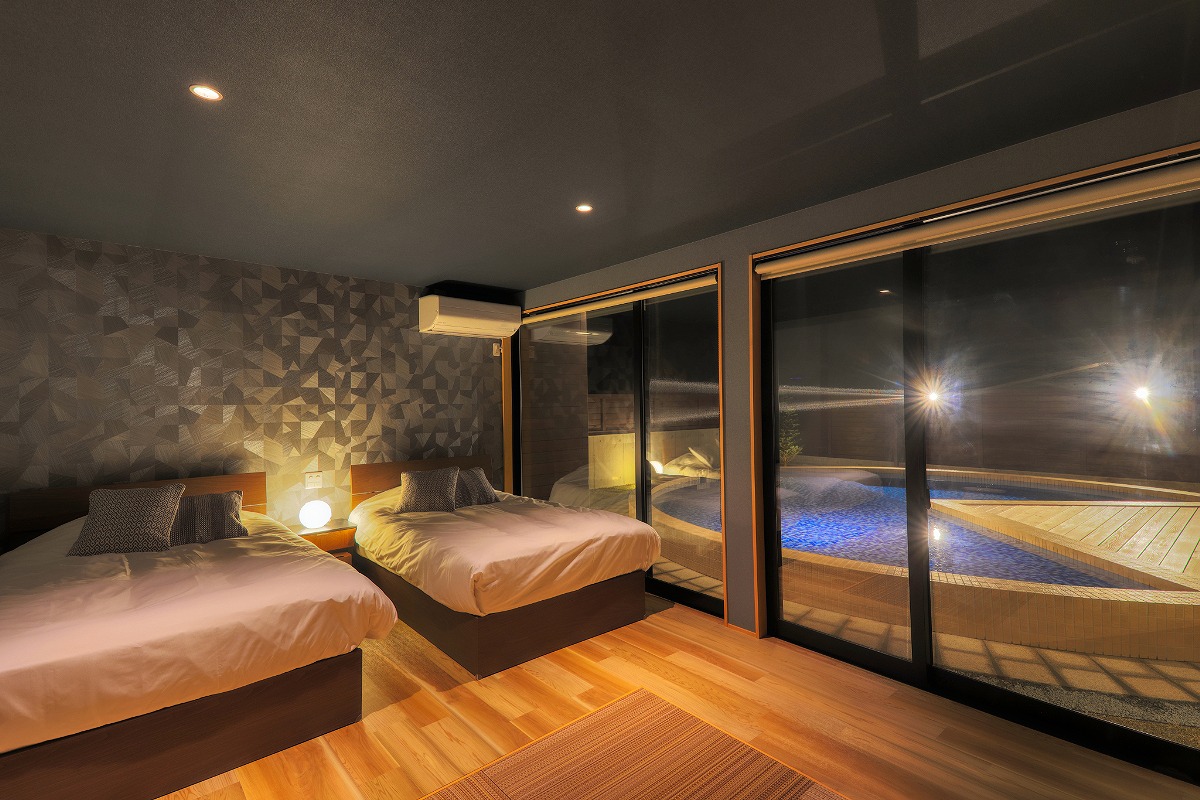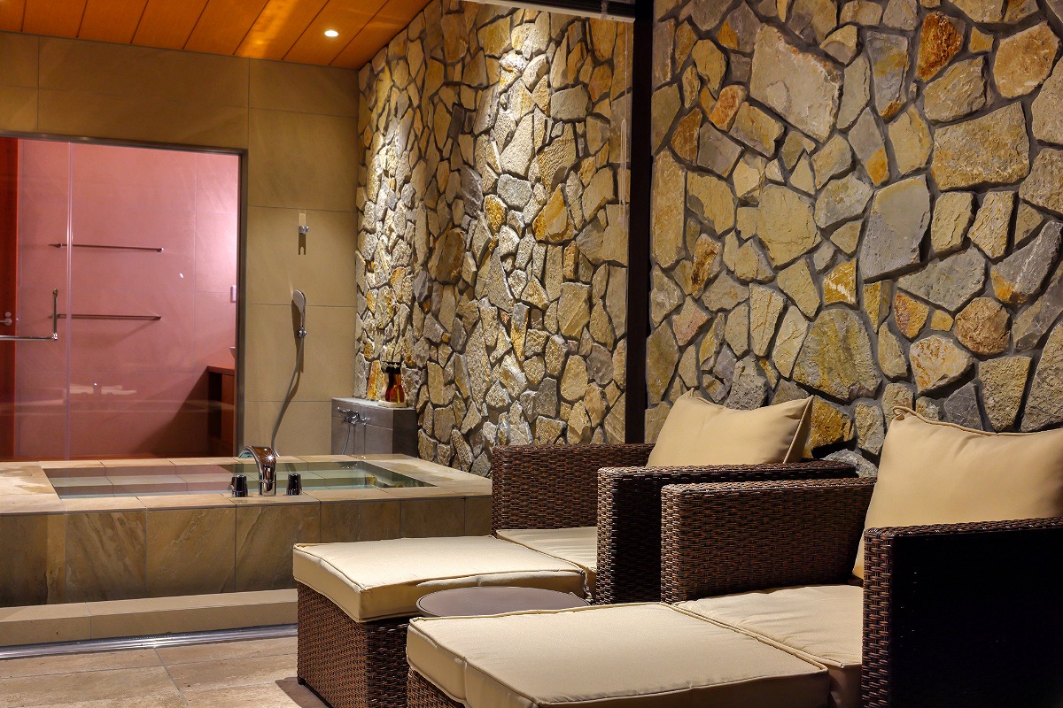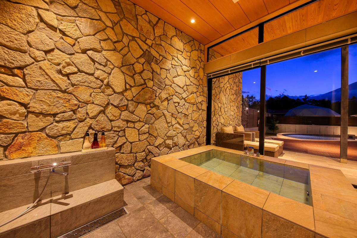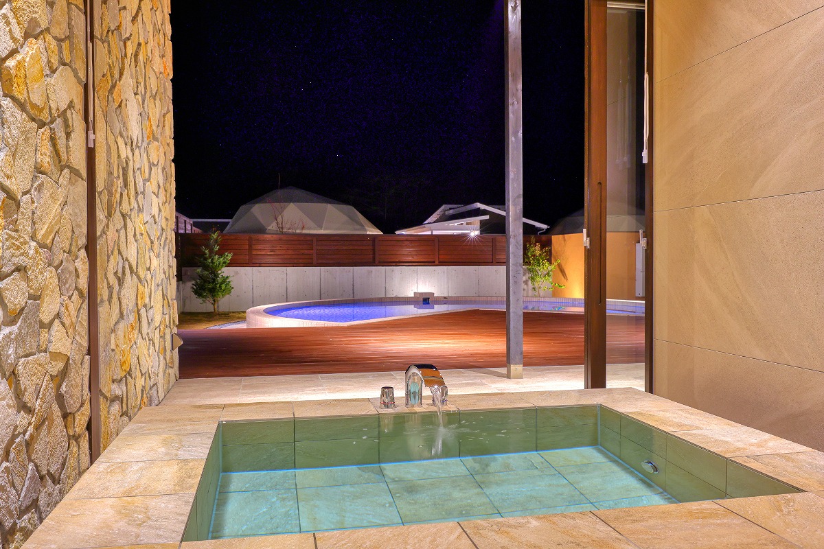 個別に天然温泉の浴室、プライベートプール、バレルサウナ、プライベートガーデン、ファイヤーピットを備えたラグジュアリーヴィラ。