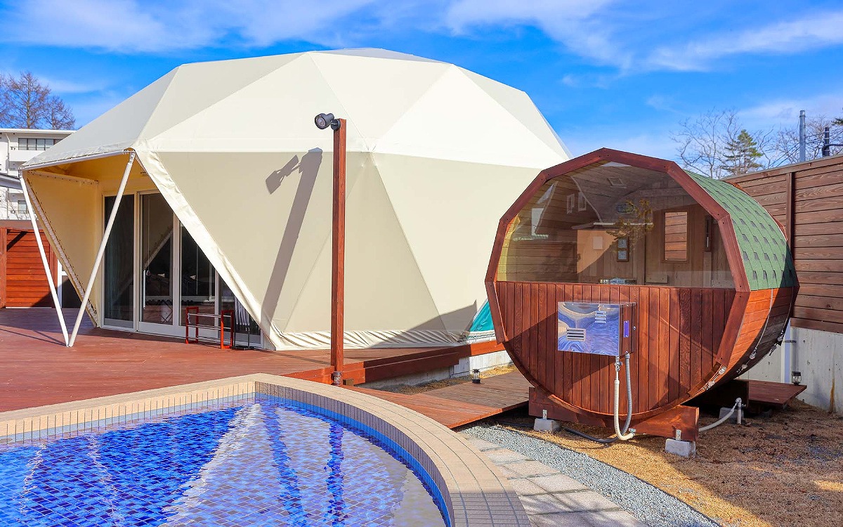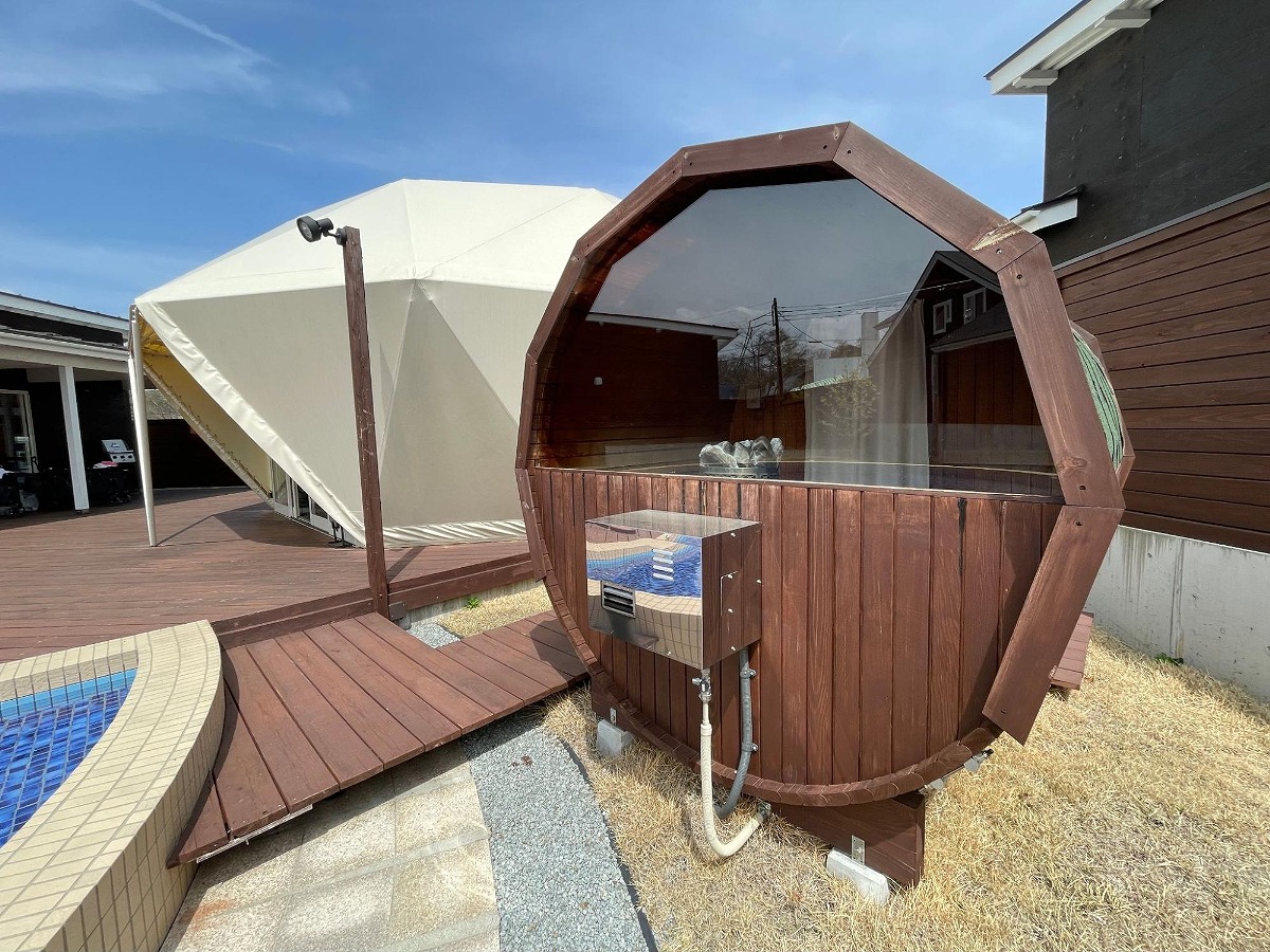 個別に天然温泉の浴室、プライベートプール、バレルサウナ、プライベートガーデン、ファイヤーピットを備えたラグジュアリーグランピング。