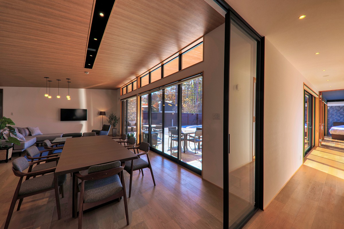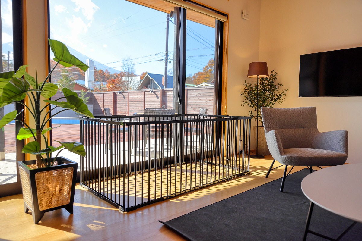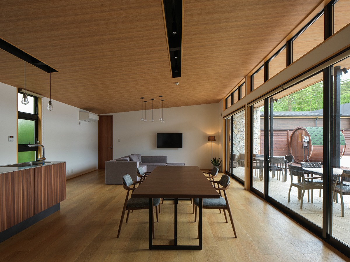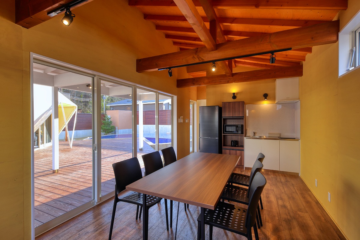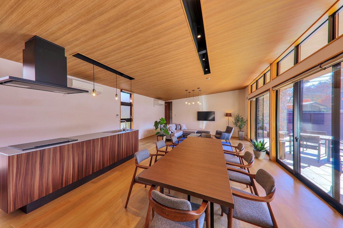 1日1棟限定の愛犬と泊まれる、広さ120㎡を誇る開放的なリビングが魅力のプライベートヴィラ。