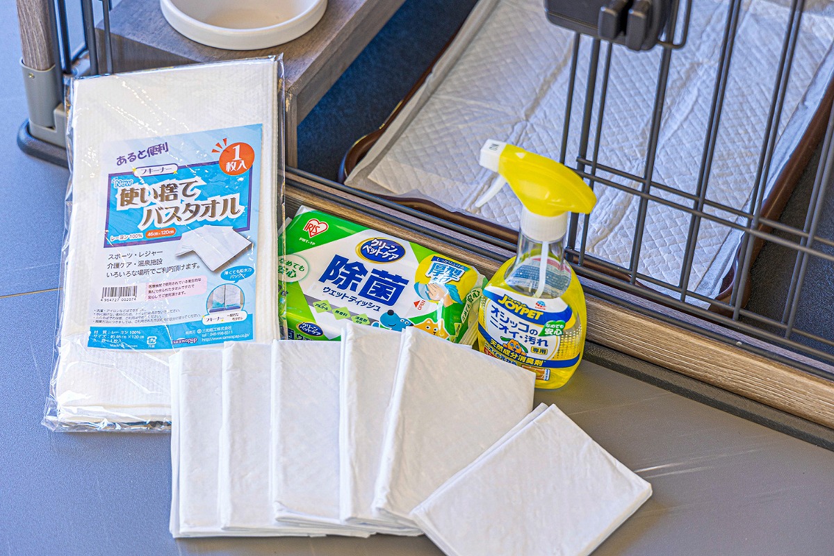 トイレトレー、トイレシーツ、サークル、食器、バスタオル、フェイスタオル、ウエットティッシュ、消臭ミスト、ウンチ処理袋